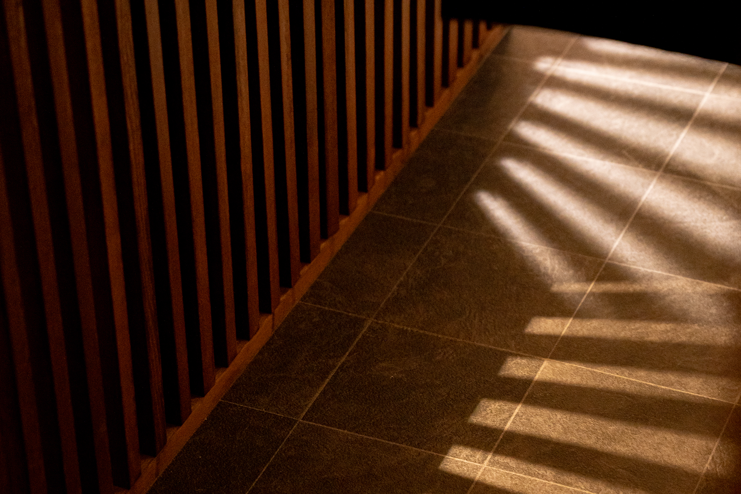 桐材や漆喰、石といった自然素材を用い、光と影のバランスを極めて、 静けさの中に緊張感が漂う美しい和の空間を描き出した。